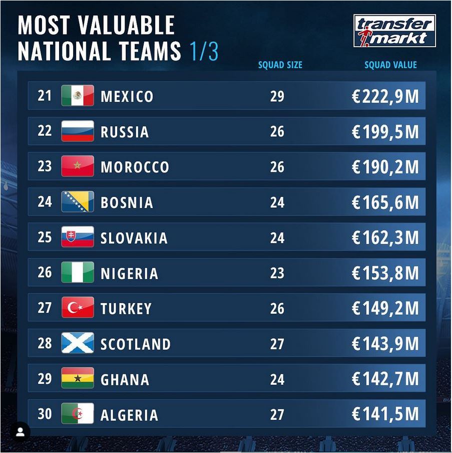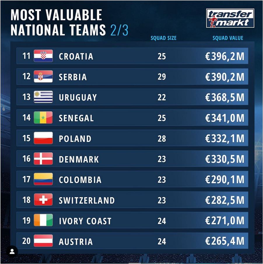 由于本期国家队集训期间各国招募的球员数量不同,因此德转的排名是计算了所有入选集训的球员的总和。除了上述前三名的国家之外,巴西队以10.1亿欧位列第四,西班牙队以8.81亿欧获得第五。意大利、阿根廷、葡萄牙、荷兰和比利时分获6-10位。