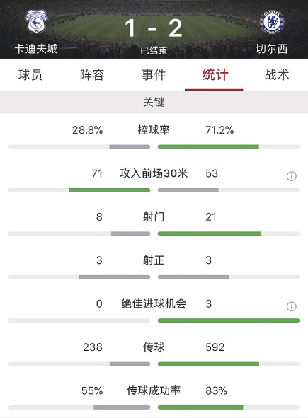 数据方面客场作战的切尔西占据绝对优势,不仅控球率达到7成,多达21脚的射门数也是高于卡迪夫城的8脚,不过其中仅有3脚射正。