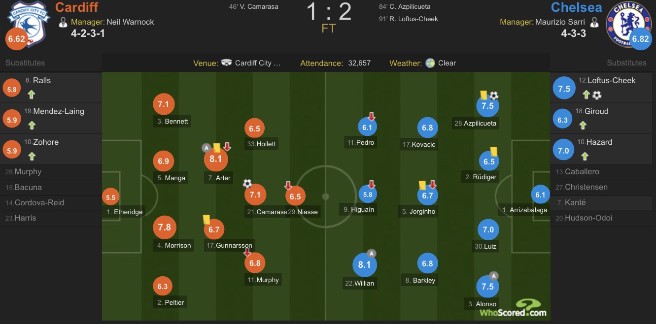 送上一次助攻的威廉和卡迪夫城的阿特共同收获本场比赛最高评分,分别打入一球的AZP和洛夫图斯-奇克评分紧随其后。