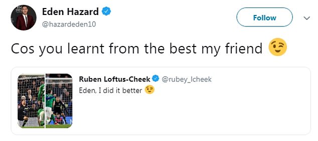 奇克赛后在推特上先调侃了阿扎尔:“埃登,我这脚可比你的漂亮吧?”随后遭到了阿扎尔的回侃:“那是因为你是从世界最佳那里偷师来的,我的朋友。”