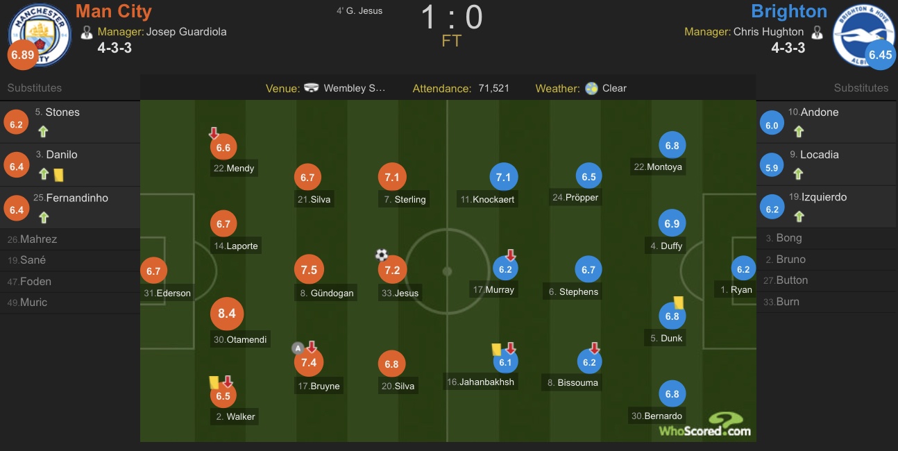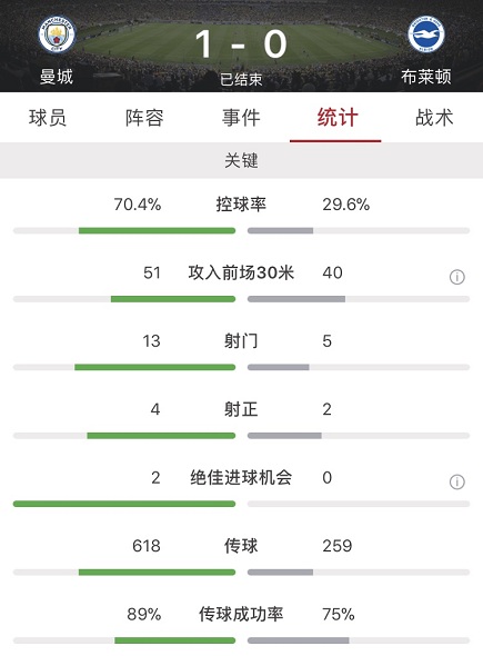 最终全场比赛结束,曼城主场1-0战胜布莱顿。