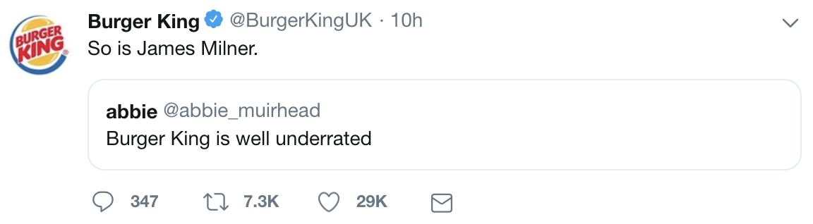 汉堡王转发了这条推特,并且写道:“詹姆斯-米尔纳也是啊!”