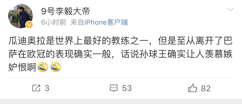 李毅也在自己的微博上对这场球赛发表了评论,他在微博中写道:“瓜迪奥拉是世界上最好的教练之一,但是至从离开了巴萨在欧冠的表现确实一般,话说孙球王确实让人羡慕嫉妒恨啊。”
