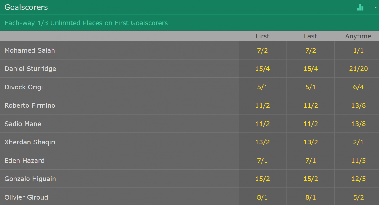 在进球者的赔率上,前五位的萨拉赫、斯图里奇、菲尔米诺、奥里吉和马内均为利物浦球员。