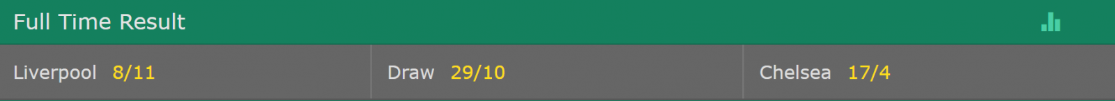 以英国机构日博给出的赔率为例,利物浦的胜赔为11赔8(约1.72),明显低于两队战平的10赔29(3.9)和切尔西取胜的4赔17(5.25)