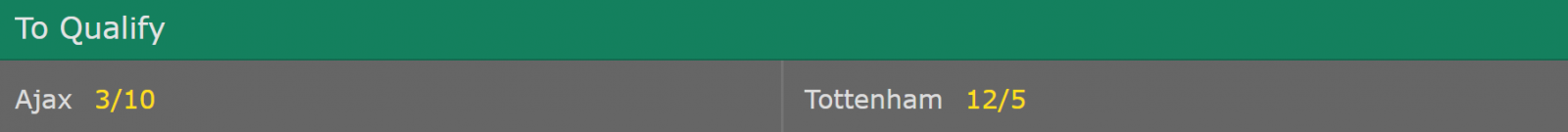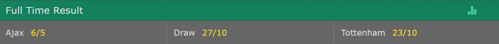 以英国机构日博的赔率为例,阿贾克斯取胜的赔率为5赔6(2.2),低于热刺取胜的10赔23(3.3)和两队战平的10赔27(3.7)。