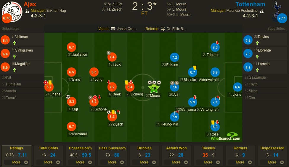 过人方面,孙兴慜8次过人全场最多,卢卡斯和西索科有4次,齐耶什是阿贾克斯队中最多的,有3次。