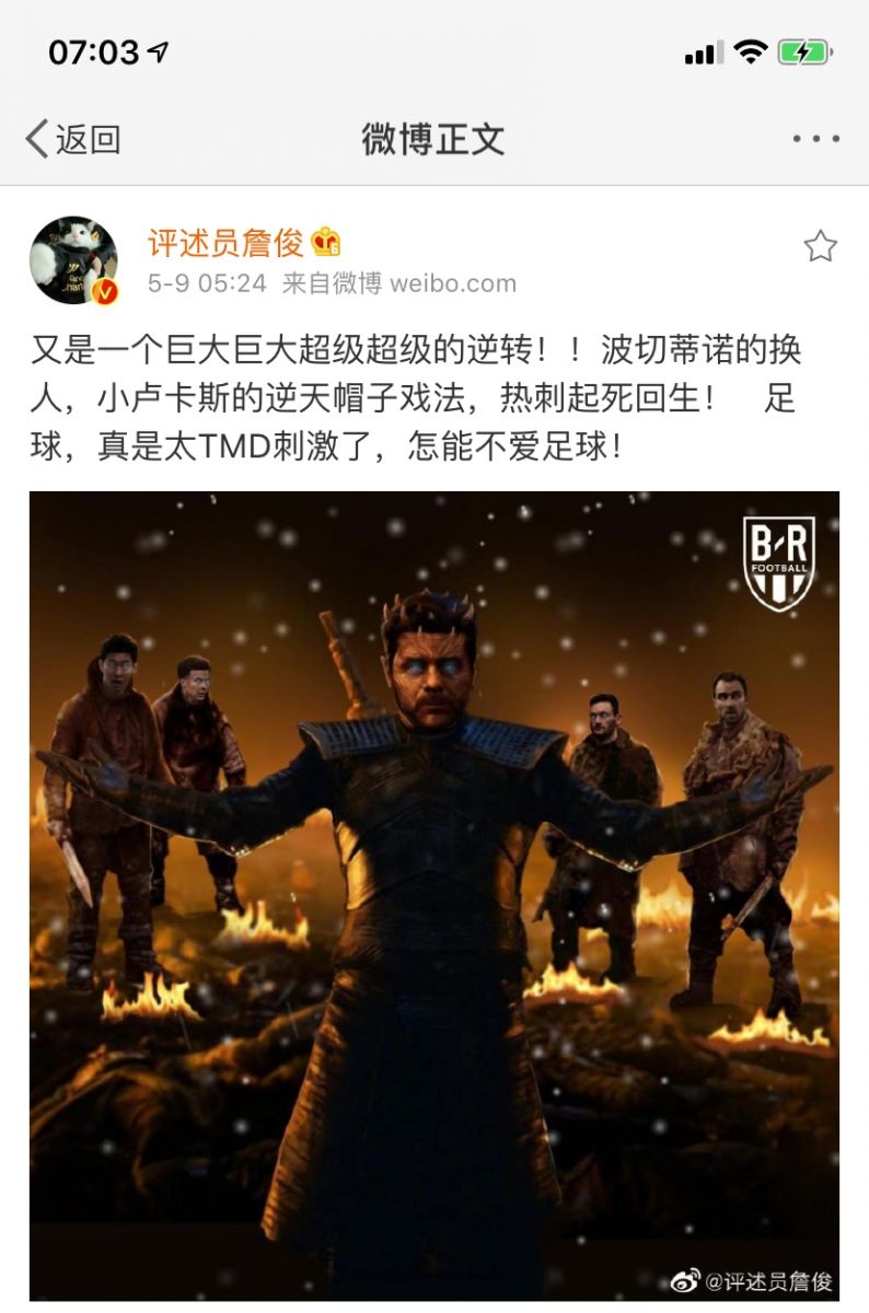 赛后,著名解说员詹俊在自己的微博上发文评价了这场比赛,他写道:“又是一个巨大巨大超级超级的逆转!!波切蒂诺的换人,小卢卡斯的逆天帽子戏法,热刺起死回生! 足球,真是太TMD刺激了,怎能不爱足球! ”