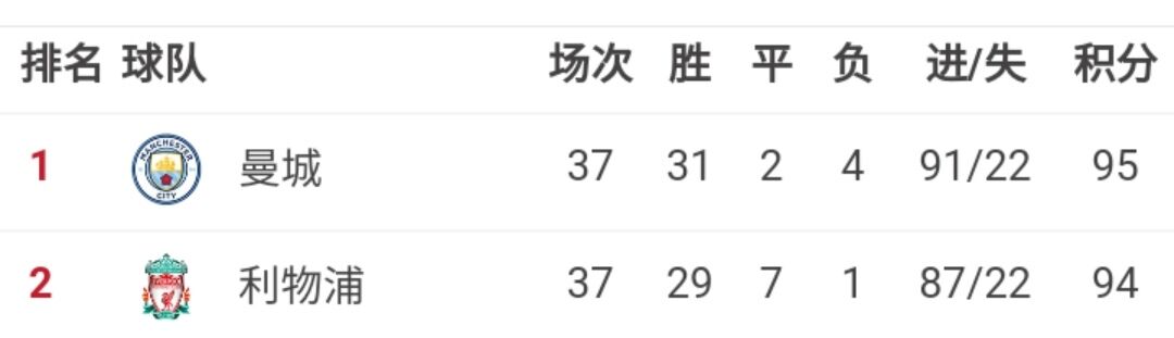 除此之外还有一种特殊情况,倘若曼城0-4输给布莱顿,而利物浦4-4战平狼队,两队的积分、进球数、净胜球数会完全相同,那么他们就需要在一块中立场地进行一场附加赛,胜者将成为本赛季的英超冠军。