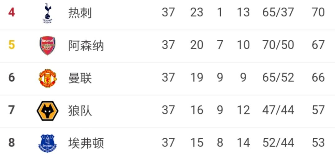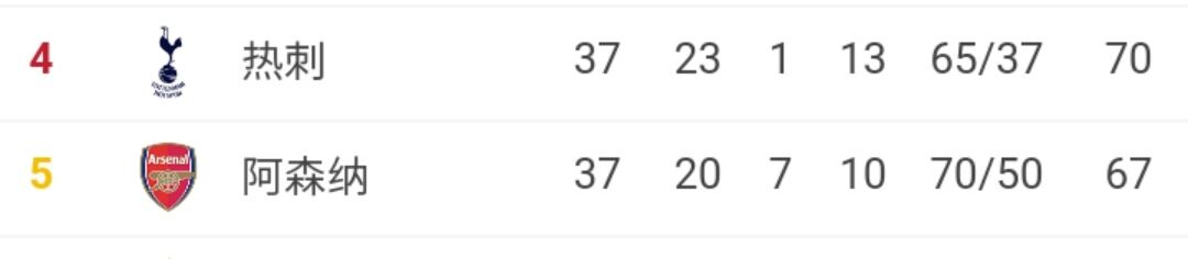热刺现在积70分排在英超第四位,阿森纳以67分紧随其后,但热刺的净胜球数比枪手多了8个。所以阿森纳跻身前四似乎只有理论可能。
