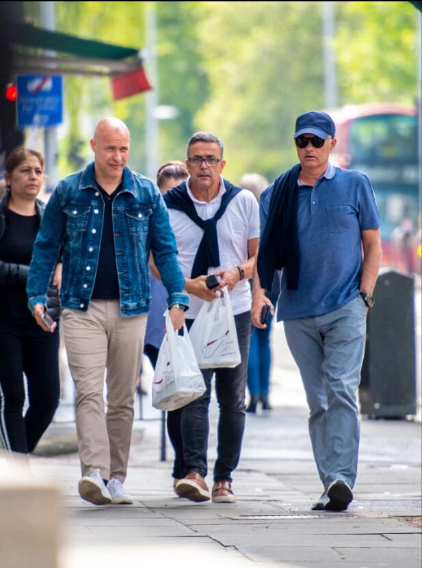 穆里尼奥身穿深蓝色Polo衫和灰色长裤,头上戴着深蓝色帽子和黑色墨镜,肩膀上搭着一件黑色外套,打扮十分休闲。穆帅与两个朋友一同在街边漫步,似乎还在交谈着什么。离开曼彻斯特后,穆里尼奥就回到了伦敦切尔西附近居住。