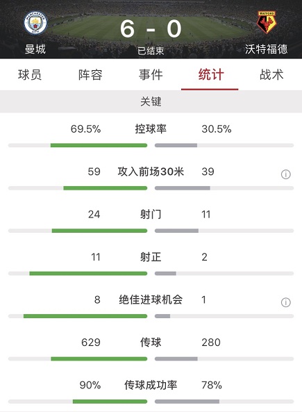 数据方面曼城全场占据绝对优势,不仅控球率达到7成,多达24脚的射门数也是远高于沃特福德的2脚,其中11脚射正。