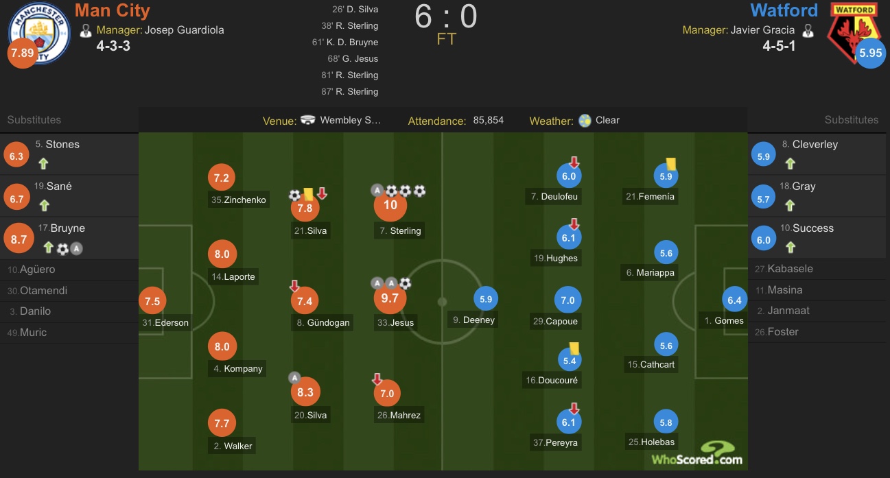最终全场比赛结束,曼城6-0战胜沃特福德夺得本赛季足总杯冠军。