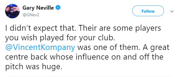 随后内维尔在推特上表示:这真的出人意料,我想说的是:总有一些球员,你希望他能在你的球队效力,孔帕尼就是其中之一。一名伟大的中卫,一名在场上和场下都影响力巨大的球员。”