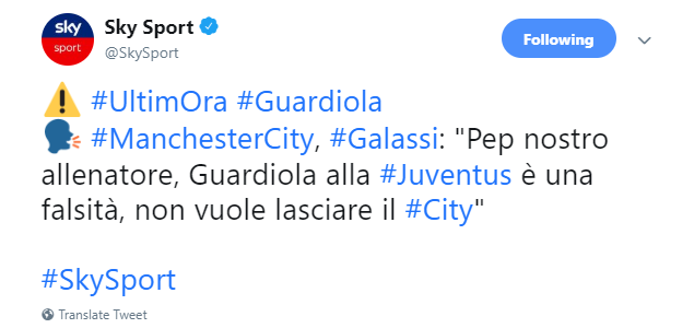 大赢家5月23日讯 此前意大利媒体报道称,瓜迪奥拉将在6月份转会尤文,对此曼城高层出面辟谣。