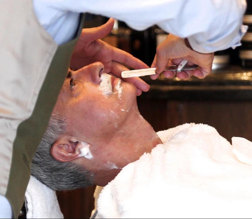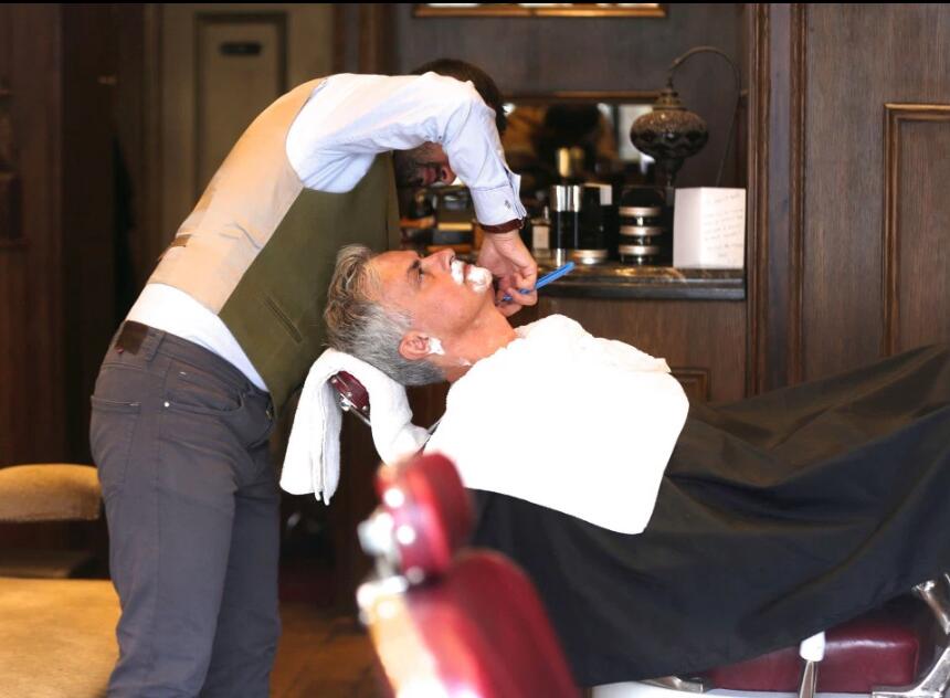 服务内容包括十个步骤:涂皮肤软化油、热毛巾热敷、蒸汽剃须刀刮胡子、热毛巾肩部按摩、冷毛巾收缩毛孔、温和去角质及清洁面膜、深层保湿及面部护理、头颈部按摩、须后水护理及手部护理。