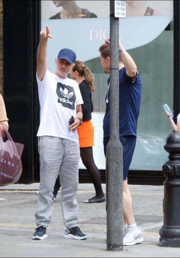 清晨穆里尼奥身穿白色阿迪达斯T恤和灰色便裤,头上戴着一顶深蓝色的帽子,出现在了伦敦西区的商业街上。路上他还碰到了前同事、切尔西俱乐部公关总监史蒂夫-阿特金斯,两人亲切地交谈了一会儿,表现得十分随性。