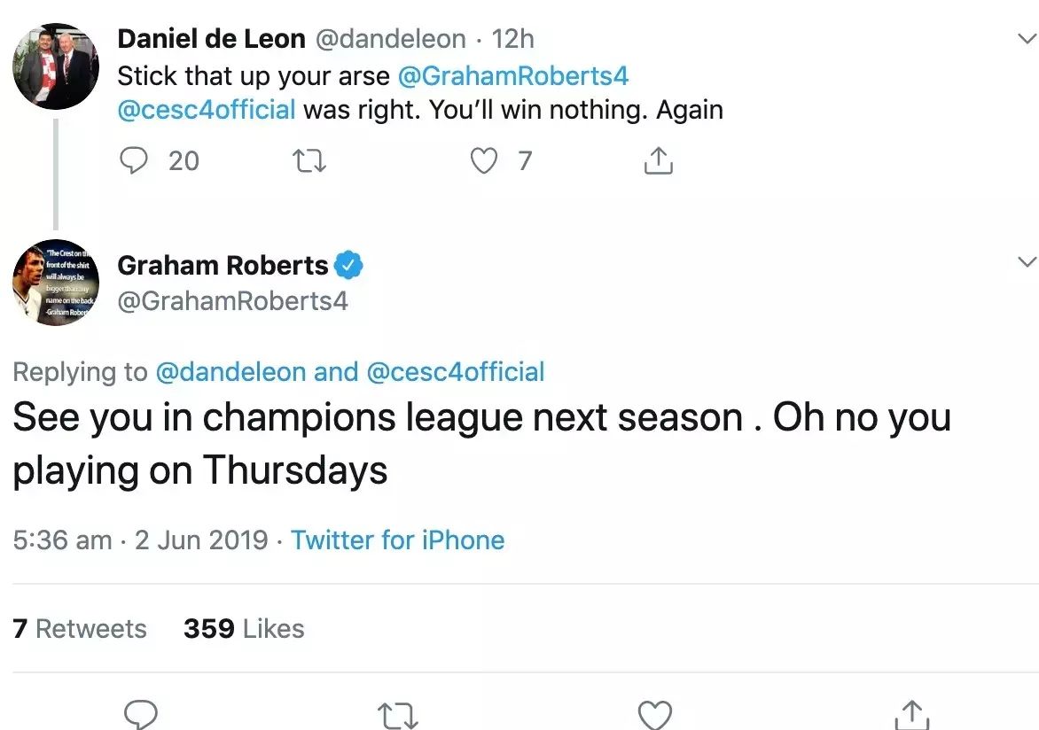 大赢家6月2日讯 本赛季早些时候,热刺名宿罗伯茨曾和切尔西旧将法布雷加斯在推特上引发了争执,罗伯茨讽刺小法在摩纳哥得不到出场机会,而小法回怼热刺无法夺冠。
