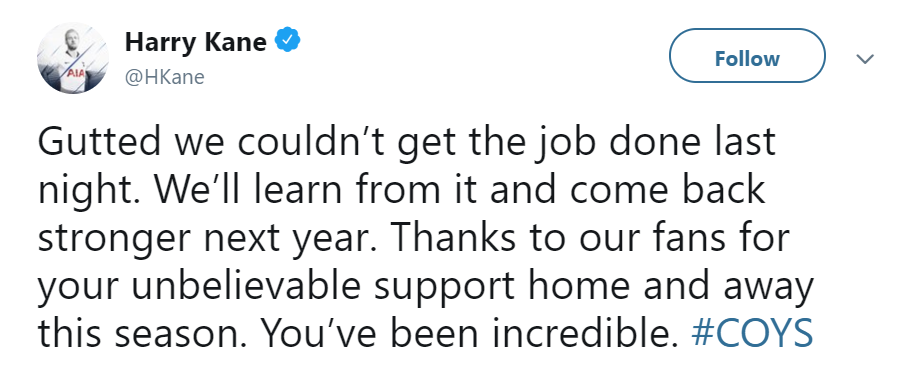 大赢家6月2日讯 2018/19欧冠决赛,热刺0-2不敌利物浦,错失欧冠冠军。赛后,凯恩发推感谢了一个赛季以来球迷们对球队的支持。