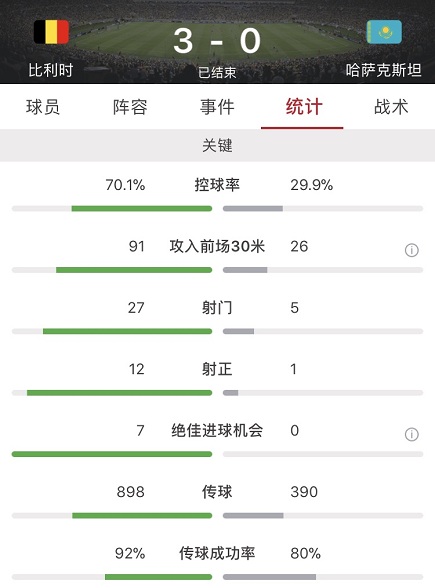 数据方面比利时全场占据绝对优势,不仅控球率达到7成,射门更是达到惊人的27脚,其中12脚射正。