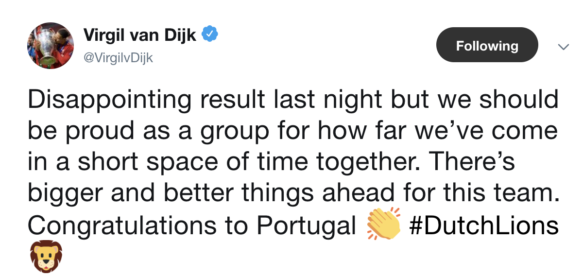 大赢家6月10日讯 荷兰在国家联赛的决赛中0-1不敌葡萄牙,和冠军擦肩而过。不过队长范戴克在赛后鼓励了球队,他在推特上写道: