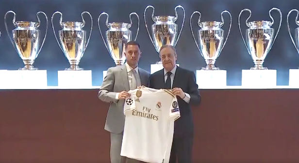 “作为皇马,我们希望更多的胜利,更多的冠军,下个赛季我们将拥有一个出色的阵容,在齐达内的带领下,向着荣誉继续发起冲击。伯纳乌主席为皇马一代成制,迪斯蒂法诺先生为皇马提纲挈领:皇马的传奇,必须要有最好的球员来书写。今天,我们欢迎世界最佳球员之一,今天,我们欢迎埃登-阿扎尔。这句话我想说很久了:阿扎尔,现在你是皇马的球员了!
