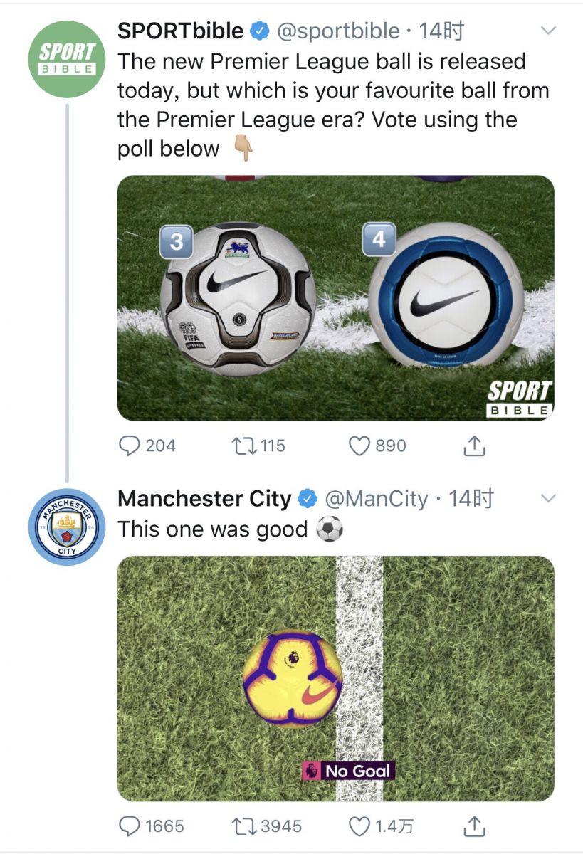 曼城官推也调皮了一把,他们转发了这条推特并回复了一张“NO GOAL”图片,是本赛季利物浦做客阿提哈德球场时那粒只差毫厘而被判无效进球的图片,曼城官推还附文:“我觉得这个球就很不错。”