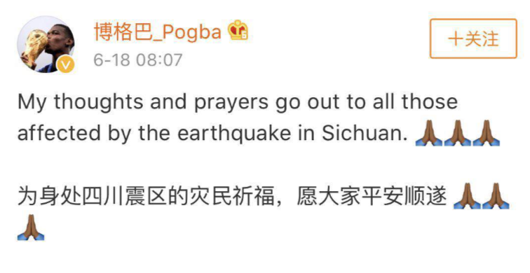 大赢家6月18日讯 四川宜宾发生6.0级的地震,博格巴前几天才刚在四川参加活动的,他在微博上为受灾的群众祈福。