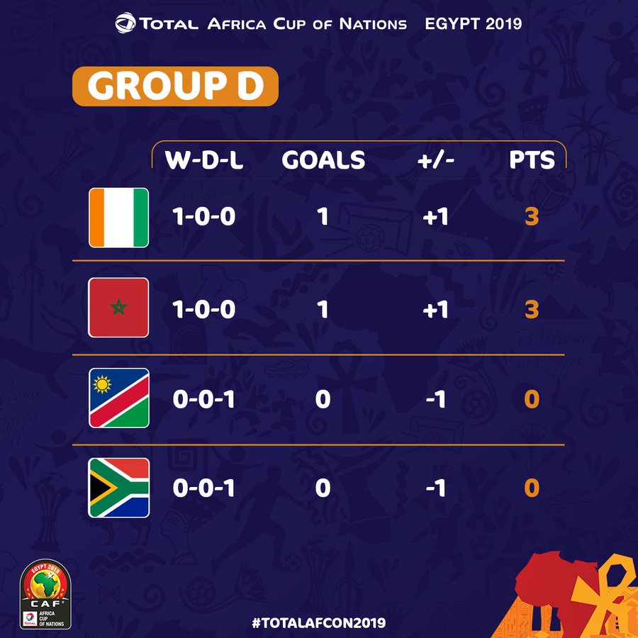 D组首轮战罢,首战取胜的科特迪瓦与摩洛哥排名前二,输球的纳 米比亚和南非积分靠后。