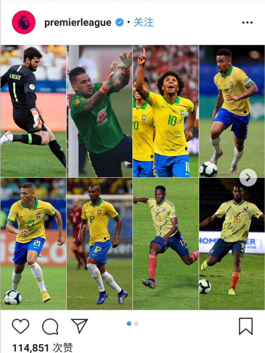 在美洲杯小组赛结束后,英超官方instagram账号上传了一张图片,包含了所有晋级淘汰赛且在英超效力的球员。巴西队的阿利松、理查利森、埃德松、威廉、费尔南迪尼奥和热苏斯悉数在列,但唯独缺少了菲尔米诺。