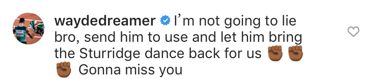 奥运会男子田径400米冠军范尼凯克也是利物浦的球迷,他在下面评论道:“我不会说谎的兄弟,把这个庆祝动作送给他去用,让他把斯图里奇舞带回来给我们。我们会想念你的!”