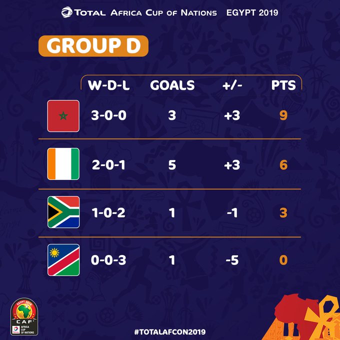 D组战罢,摩洛哥和科特迪瓦分别以小组头两名出线,南非积3分尚存晋级可能,纳 米比亚全败出局。