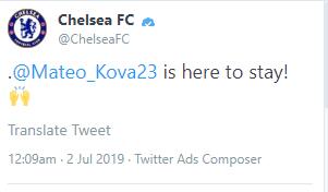 随后,切尔西官方也对科瓦契奇表示了欢迎。