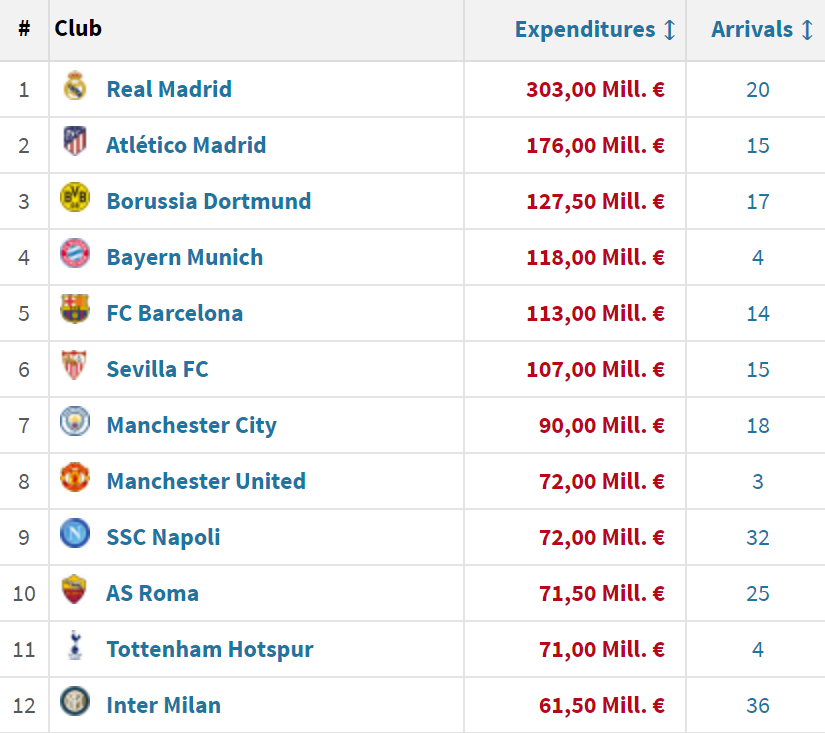 多特、拜仁、巴萨和塞维利亚的转会投入均超过1亿欧,位列3-6位。曼城、曼联、那不勒斯、罗马、热刺、国米分列7-12位。