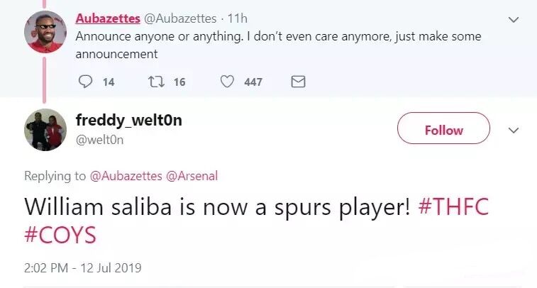 一位阿森纳球迷发推称:“阿森纳搞快搞些官宣吧,我不管是谁或者什么事,搞快宣布点什么吧!”一热刺球迷在此推特下评论:“我宣布萨利巴是热刺的啦!”