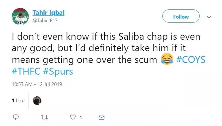 大赢家7月13日讯 此前有报道称,热刺可能会截胡阿森纳,签下圣埃蒂安的法国小将萨利巴,然而网络上的热刺球迷对此事更为兴奋,纷纷留言就算不认识萨利巴,但因为是对手是阿森纳,无论如何都支持截胡。