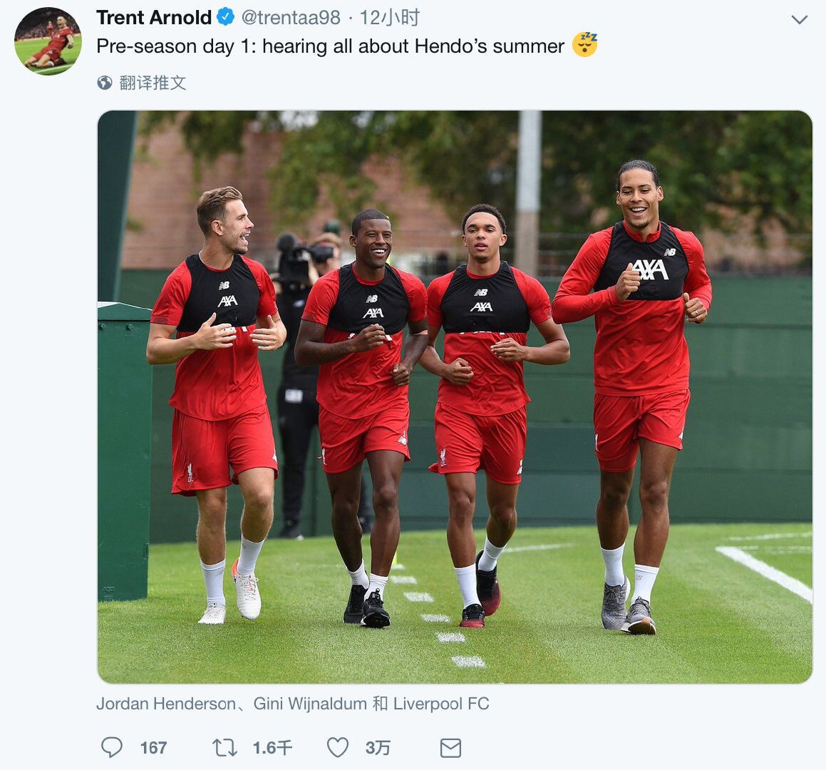 大赢家7月14日讯 在昨天利物浦新归队的四位球员阿诺德、亨德森、范戴克以及维纳尔杜姆结束季前赛第一天训练后,阿诺德在推特上发布了一条吐槽队长的话。