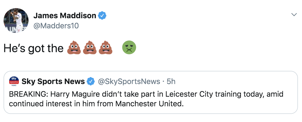 不过马奎尔在莱斯特城的队友麦迪逊则代他进行了解释,麦迪逊表示:“马奎尔拉肚子了。”