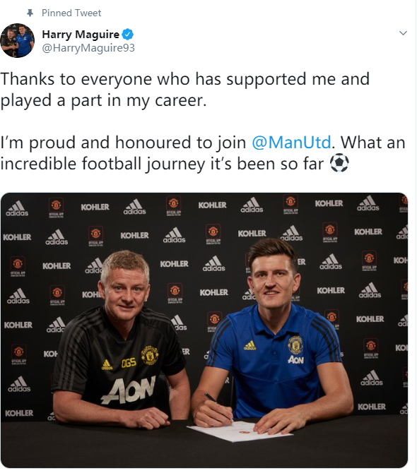 马奎尔本人在曼联官宣之后也立即更改了自己的推特头像,并发文写道:“感谢所有支持我的并在我职业生涯中扮演重要角色的人,加盟曼联让我感到无比的骄傲和荣耀。这真是一段不可思议的足球之旅。”