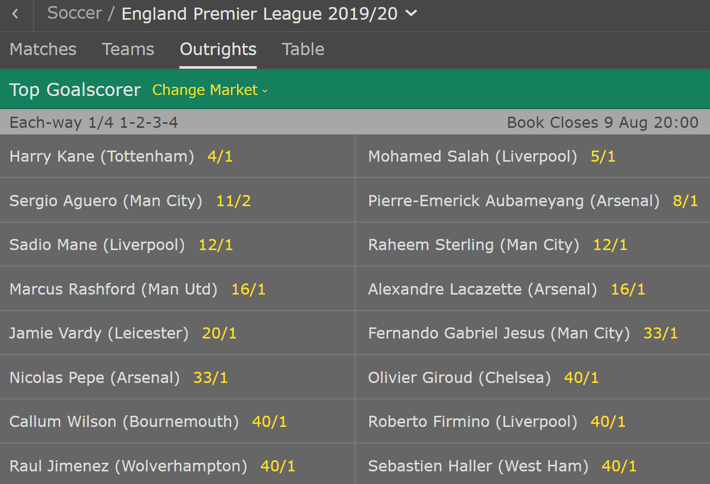 大赢家8月9日讯 新赛季英超联赛即将于明天凌晨拉开帷幕,各大机构更新了球员摘得金靴的赔率,凯恩、萨拉赫、阿圭罗、奥巴梅扬列前四。