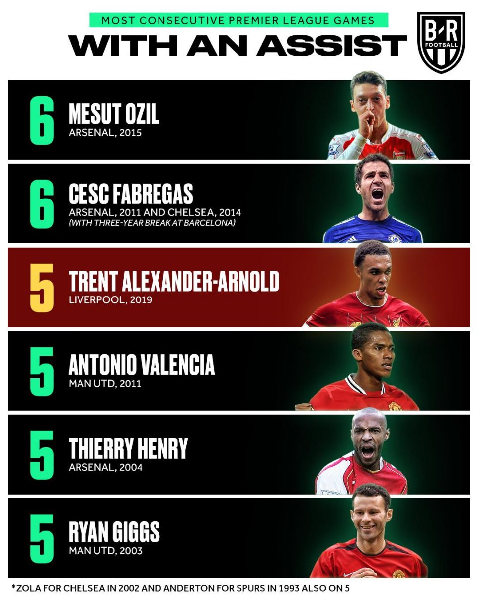 阿诺德也成为了英超历史上第8位连续5场比赛都有助攻入账的球员,也是利物浦历史上的第1位球员。 排在他前面的是厄齐尔和法布雷加斯,他们的纪录是连续六场比赛都有助攻表现。
