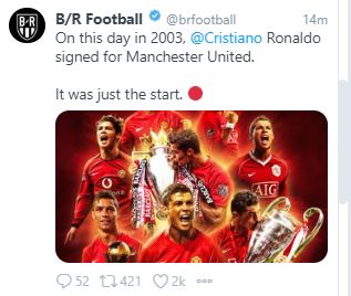 大赢家8月12日讯 2003年的今天,曼联与C罗正式签约。今天B/R也制作了一幅海报,并在配文中写道:“2003年的今天,曼联正式签下C罗,这仅仅是一切的开始。”