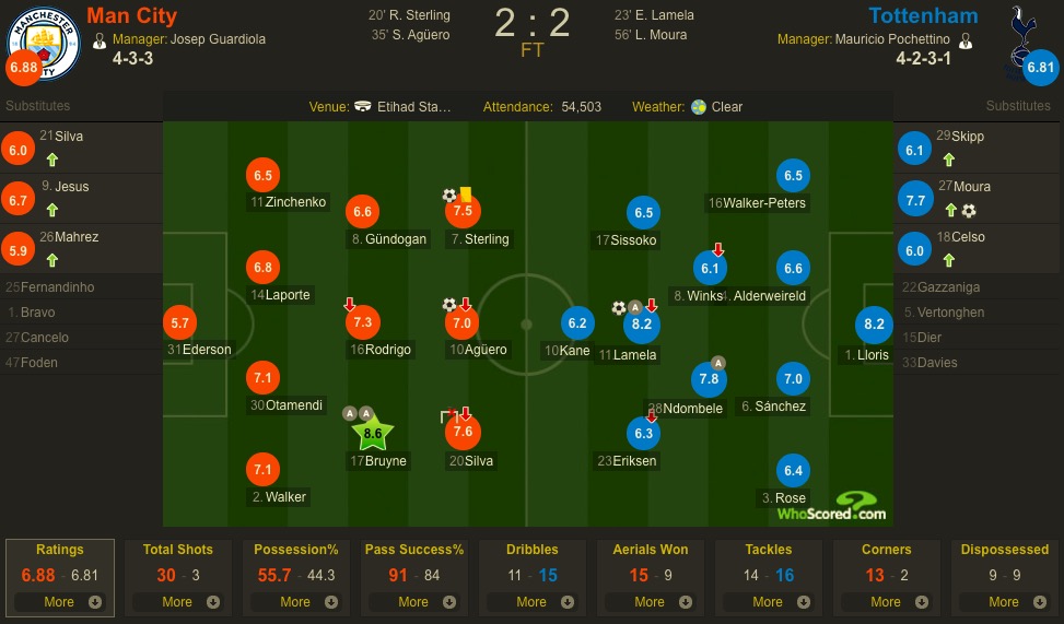 射门数据上,斯特林6次,B席5次,德布劳内和热苏斯各4次,阿圭罗3次,津琴科、京多安和奥塔门迪各2次,拉波特、罗德里、凯恩、拉梅拉和小卢卡斯各1次,但后两位都转化成了进球。
