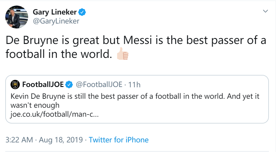 莱因克尔则转发了这则推特,并写道:“德布劳内是很棒,但是梅西才是世界上最好的传球手。”