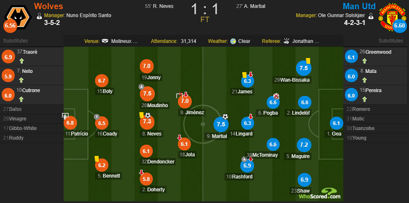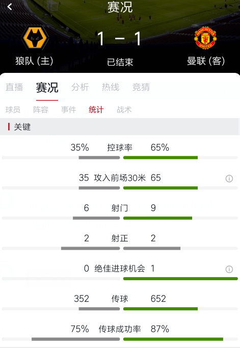 终场哨响,曼联客场1-1战平狼队。