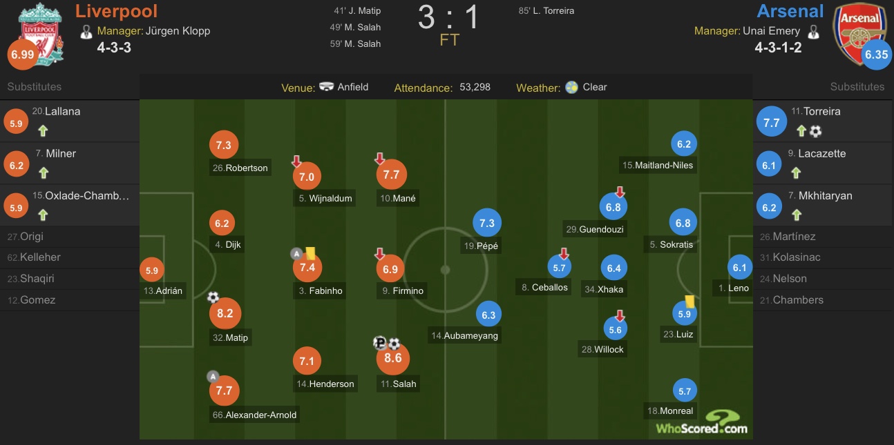 梅开二度的萨拉赫收获本场比赛最高评分,头球破门的马蒂普评分紧随其后,阿森纳方面则是替补登场打入一球的托雷拉收获队内最高评分。