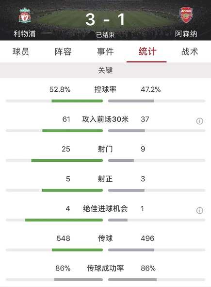 数据方面两队控球率旗鼓相当,利物浦多达25脚的射门数远高于阿森纳的9脚,其中5脚射正。