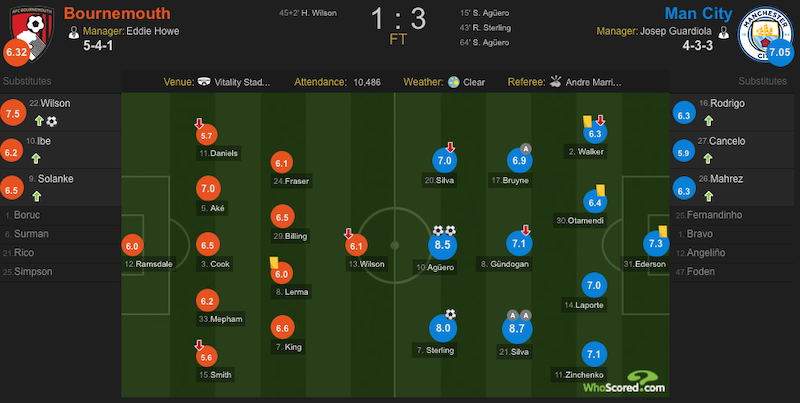 本场比赛两送助攻的大卫-席尔瓦8.7的全场最高分,阿圭罗获得8.5紧随其后。