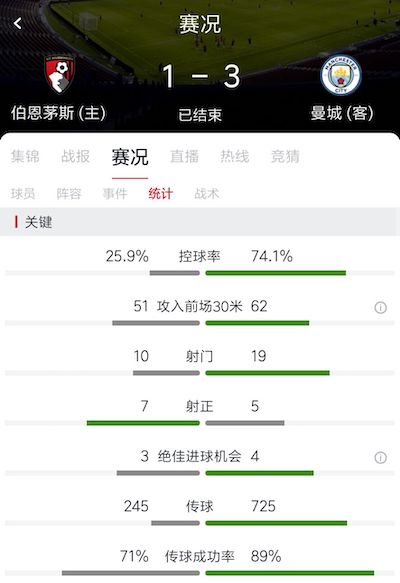 最终比赛结束,曼城3-1客胜伯恩茅斯。
