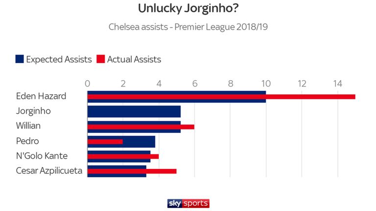 下图为切尔西上赛季的预计助攻数(深蓝色)和实际助攻数(红色),若日尼奥有不错的预期助攻数,实际助攻却为0。
